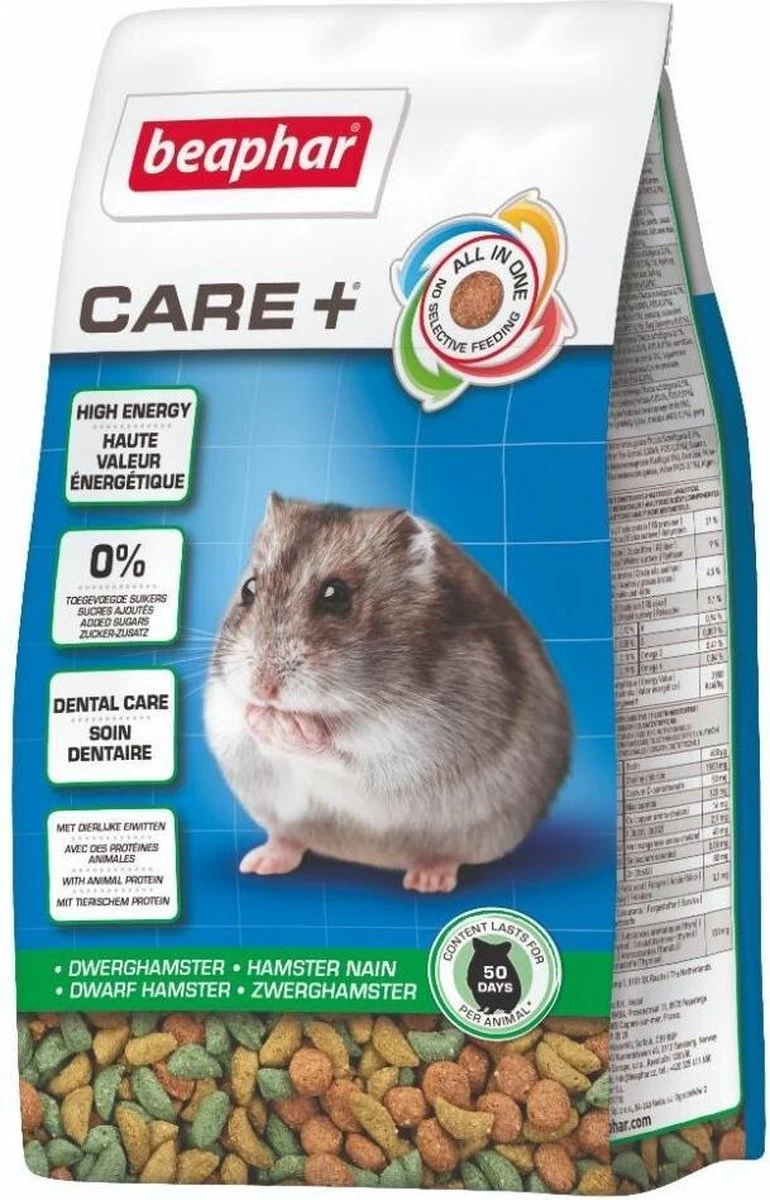 Care+ Dwerghamster is een zeer smaakvolle super premium voeding. Het is ontwikkeld in samenwerking met dierenartsen en voedingsdeskundigen. Care+ is geëxtrudeerd, deze hittebehandeling maakt een betere vertering van eiwitten uit het voer mogelijk. De ingrediënten zijn afgestemd op de voedingsbehoefte en benaderen het natuurlijke voedingspatroon.