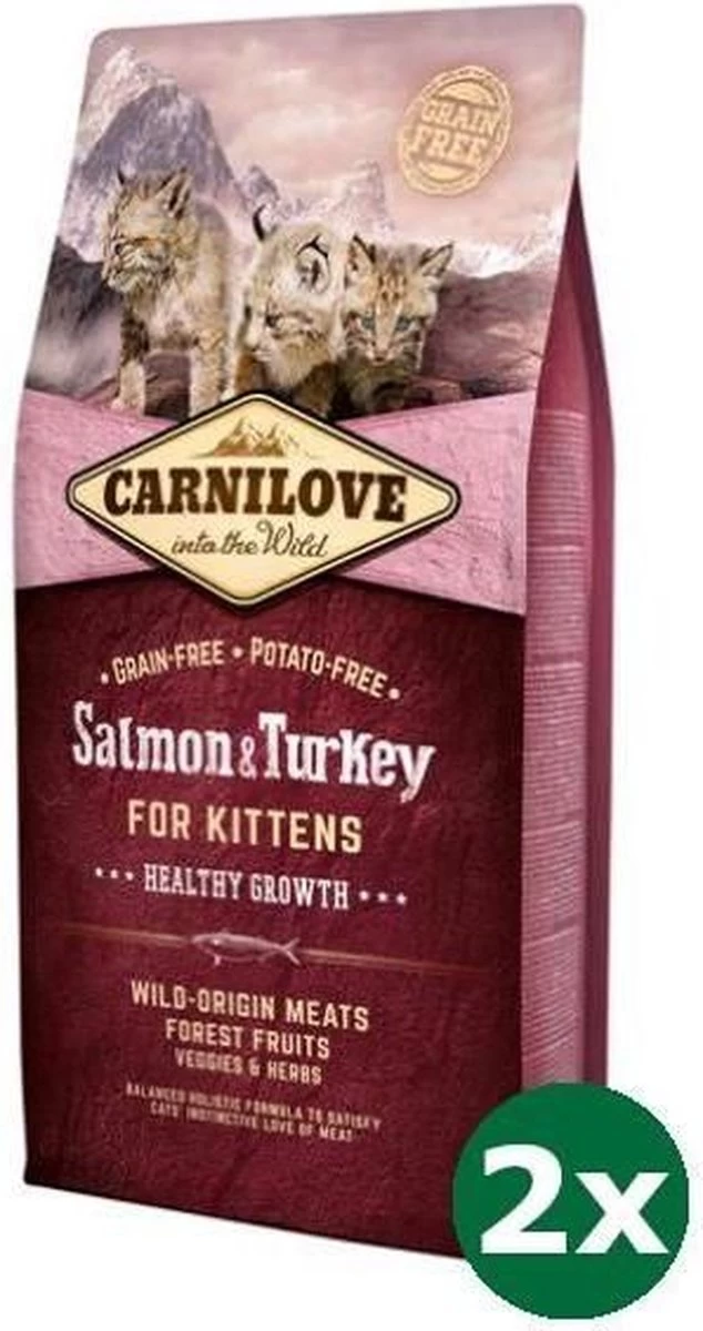 Carnilove Salmon/Turkey Kittens 400 gr Carnilove Salmon/Turkey Kittens 400 gr is graanvrij, kwalitatief hoogwaardig volledig kittenvoer voor jonge katten met zalm en kalkoen, aansluitend bij de natuurlijke voedingsbehoefte van de kat. Deze brokken zijn geheel vrij van aardappel en graan, omdat deze ook niet in het natuurlijke dieet van de wilde kat en diens voorouders voorkomt. In plaats daarvan is er gebruik gemaakt van ingrediΓ«nten die beter aansluiten bij de voedingsbehoefte van de kat, namelijk een hoog aandeel dierlijke ingrediΓ«nten gecombineerd met verse groenten, fruit, kruiden en mineralen. Deze bevatten belangrijke vitaminen en anti-oxidanten, die door de structuur van de gebruikte eiwitten optimaal opgenomen worden door het lichaam. Het voer is nauwkeurig uitgebalanceerd, makkelijker verteerbaar, holistisch en ook gewoon heel erg lekker. Voor een gezonde, goede groei! β Holistische kattenvoeding voor kittens- Hoog in vleesper