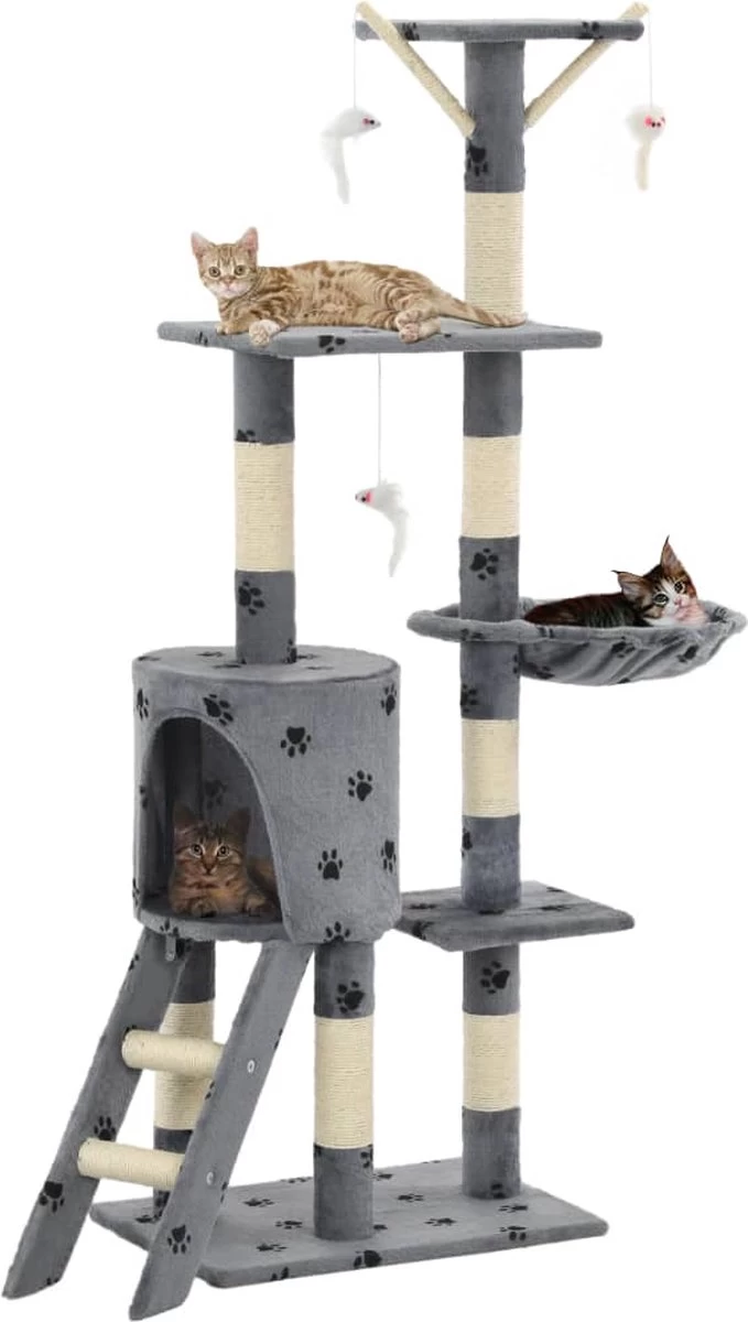 De pluche, bedekte krabpalen zijn gewikkeld in sisal touw, wat zeer comfortabel en handig is voor je kattenvriend om zijn klauwen scherp te houden. Je katten zullen het leuk vinden om achter elkaar aan te rennen terwijl ze op en neer springen op dit leuke speelcentrum. Onze kattenkrabpaal is ontworpen met een gezellig huis waar je kat een dutje kan doen of kan ontspannen. Hij heeft ook 3 muizenspeeltjes, uitkijkplatformen en ontspanningsruimtes om je kleine vriend te vermaken. De basis van deze kattenkrabboom is stevig en stabiel.