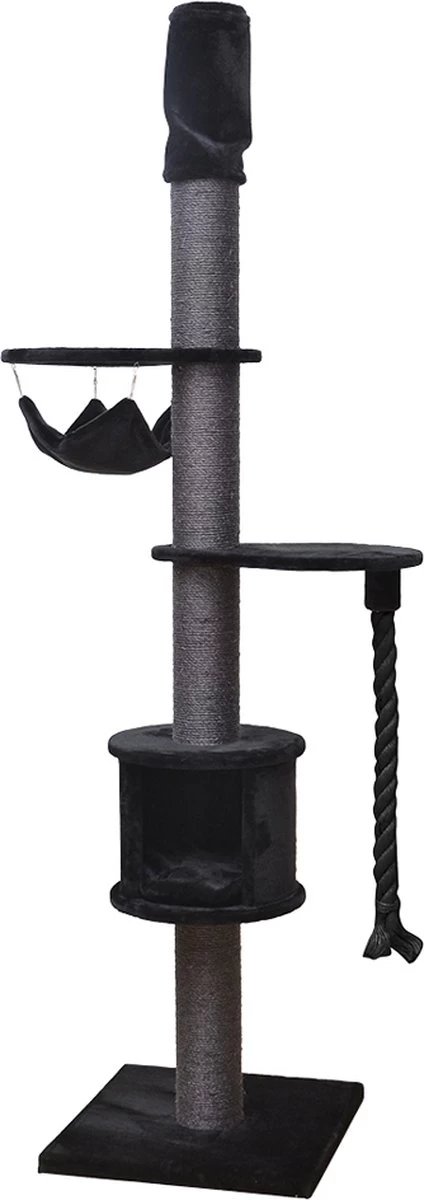 Deze grote, luxe plafondkrabpaal is perfect voor jouw klimmer! Doordat de krabpaal over dikke sisalpalen van wel 15 centimeter beschikt, is de paal stevig en ook goed geschikt voor grotere kattenrassen. Verder beschikt de paal over een dik speeltouw, een slaaphuisje en een mooie hangmat, zodat jouw kat kan krabben, spelen en slapen. Doordat de plafondkrabpaal vooral in de hoogte reikt, is de krabpaal in de breedte ruimte besparend. De krabpaal is dus ook geschikt als je wat minder ruimte ter beschikking hebt. De krabpaal heeft een breedte van circa 58 centimeter, en een hoogte die verstelbaar is 220 tot 250 centimeter middels een draaisysteem.