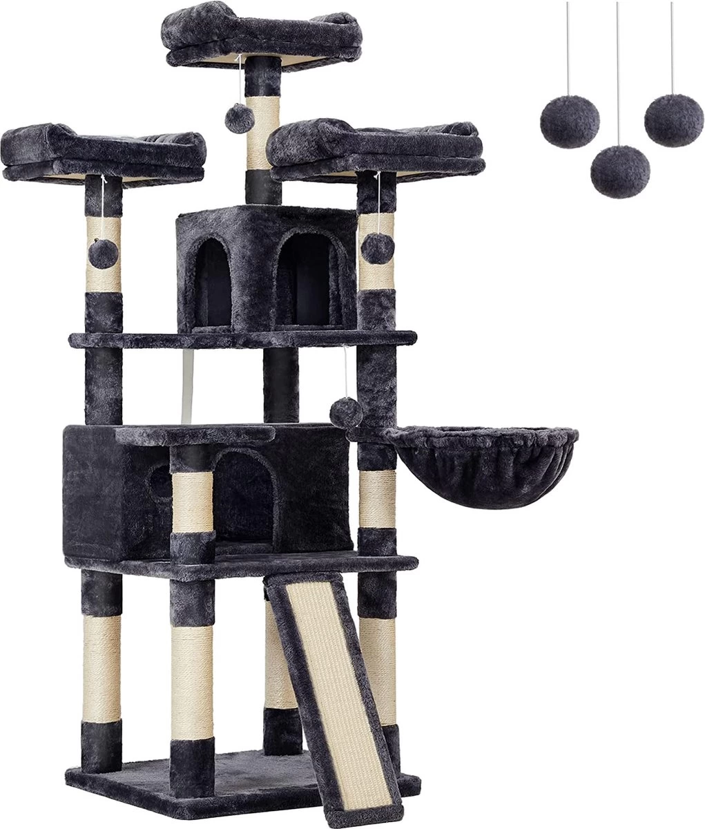 - Klimparadijs: 3 grote uitkijkplatforms, 2 huizen, 1 hangmat, 3 pluche ballen… Wauw, zoveel elementen?! Deze krabpaal is een waar paradijs en biedt katten het hele jaar door een spannend entertainmentprogramma