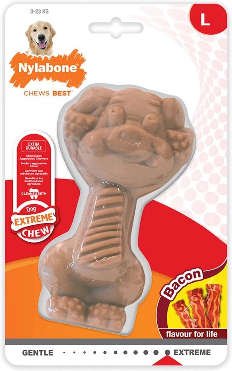 Honden hebben een sterk gebit waarmee ze goed kunnen kauwen. Een kauwsnack gemaakt van natuurlijk materiaal eten ze vaak snel op, zo hebben ze er maar kort plezier van. Met de Extreme Chew Pig van Nylabone houd je jouw hond wel even bezig!