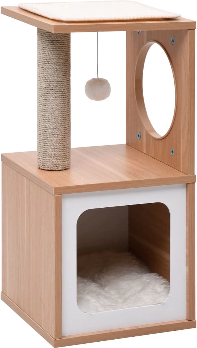 Je kattenvriendjes kunnen hun klauwen scherper maken met de jute krabpalen. Dit zorgt voor een gezonde uitlaatklep voor de krablust van je katten. Ze vinden het ook heerlijk om achter elkaar aan te rennen terwijl ze van en op dit leuke speelmeubel springen. Wanneer ze genoeg gespeeld hebben kunnen je kleine vriendjes uitrusten op de bovenste platformen, waar ze een beter uitzicht hebben. De sisal mat bovenop de bovenplank kan verwijderd worden. Ons kattenmeubel is ontworpen met een knus huisje waarin je kat kan luieren. Het kussen van deze kattentoren is verwijderbaar en wasbaar. De basis van deze kattenkrabpaal is stevig en stabiel.